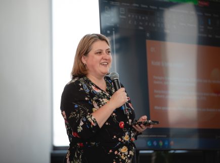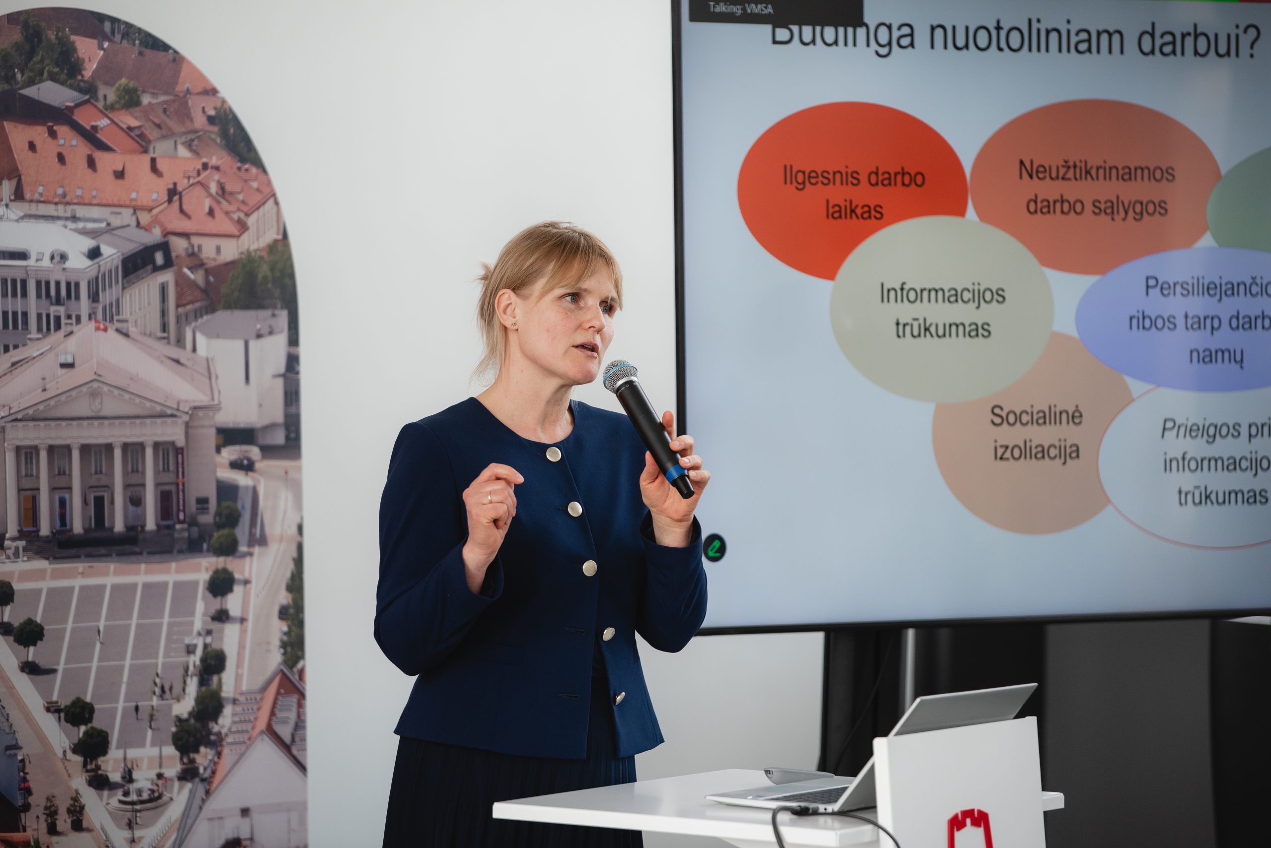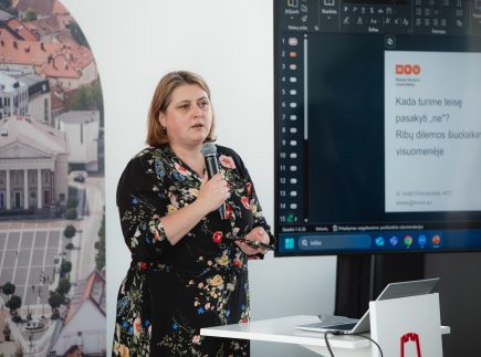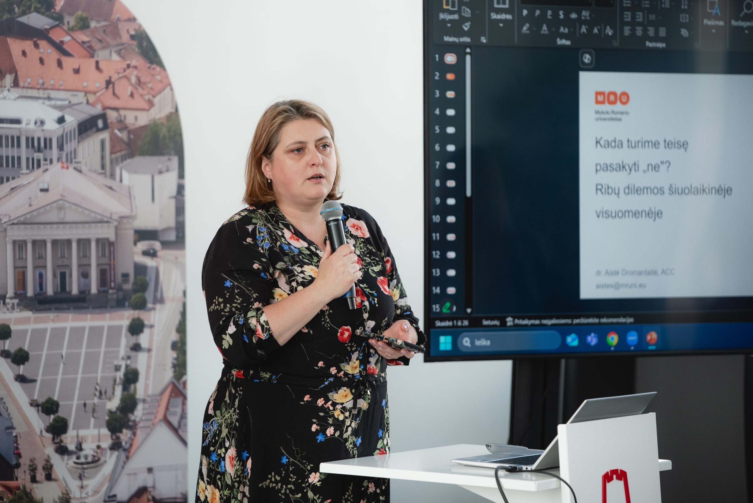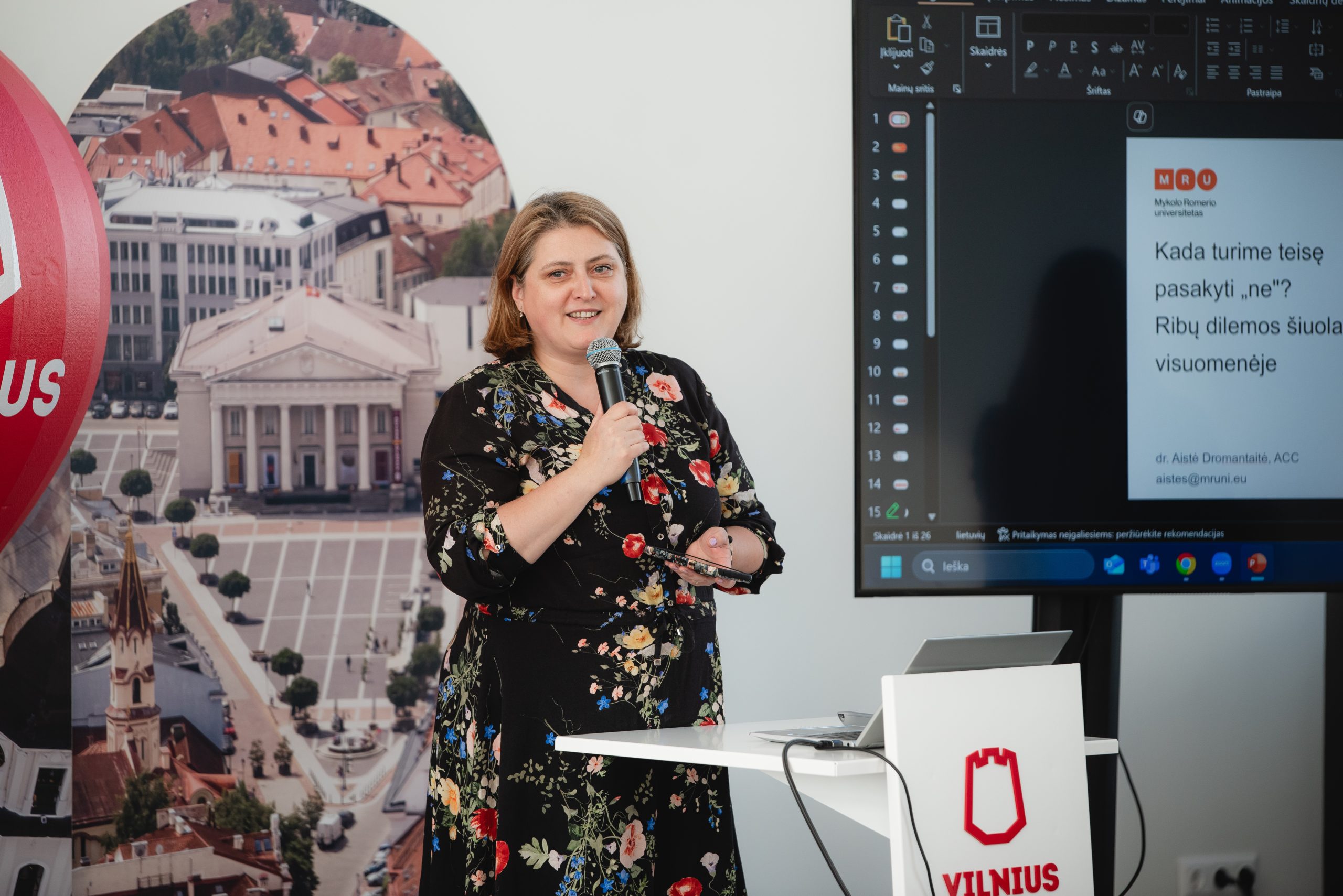 Prof. dr. Aistė Dromantaitė (MRU) įtaigiai pristatė ribų svarbą asmeniniame ir profesiniame gyvenime, palygindama jas su namais, visur atidarytais langais – kartais būtina užverti kelis, kad apsisaugotume nuo išorinio chaoso.