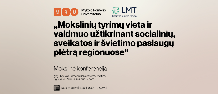 Lapkričio 26 d. Mykolo Romerio universitete (MRU) vyks mokslinė konferencija „Mokslinių tyrimų vieta ir vaidmuo užtikrinant socialinių, sveikatos ir švietimo paslaugų plėtrą regionuose“. Renginyje bus diskutuojama, kaip moksliniai tyrimai gali tapti realiu įrankiu sprendžiant svarbiausius Lietuvos regionų iššūkius – nuo socialinės atskirties mažinimo iki švietimo kokybės stiprinimo ir sveikatos paslaugų prieinamumo didinimo.