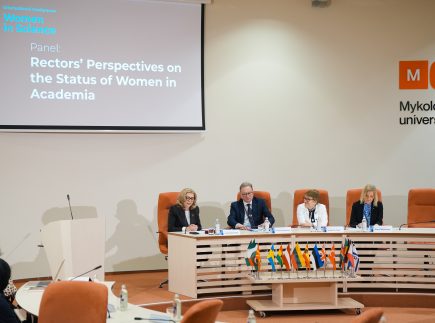 Diskusijoje „Rektorių įžvalgos į moterų padėtį akademinėje aplinkoje“ (angl. “Rectors’ Perspectives on the Status of Women in Academia“), kurią moderavo MRU rektorė prof. dr. Inga Žalėnienė, buvo aptariami moterų padėties akademinėje bendruomenėje klausimai. Universitetų rektoriai dalijosi mintimis apie lyčių lygybės situaciją aukštajame moksle bei institucijų vaidmenį kuriant įtraukią ir lygiomis galimybėmis grįstą akademinę aplinką. Jie akcentavo universitetų vadovų lyderystės svarbą užtikrinant tinkamas sąlygas moterų akademiniam darbui, būtinybę stiprinti moterų matomumą ir dalyvavimą sprendimų priėmimo procesuose.