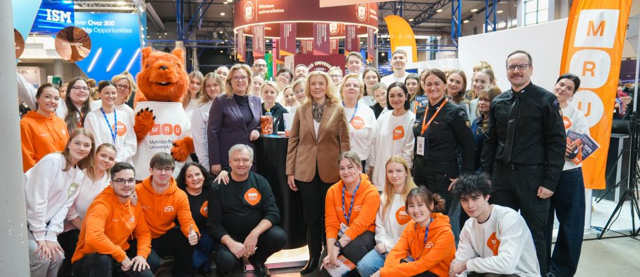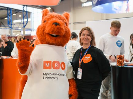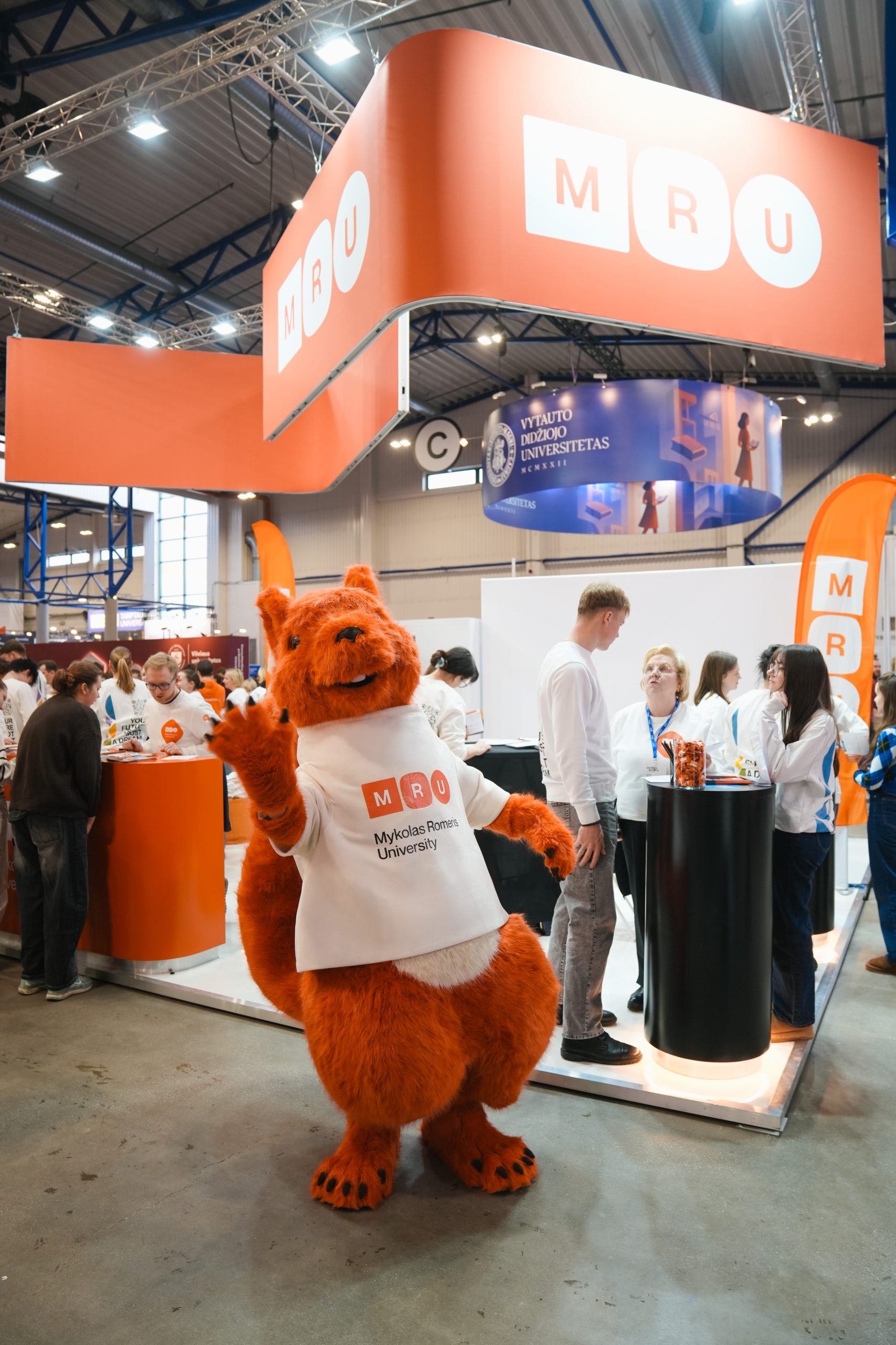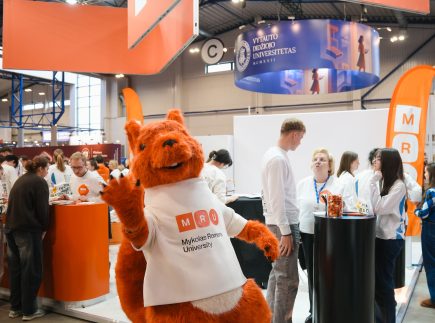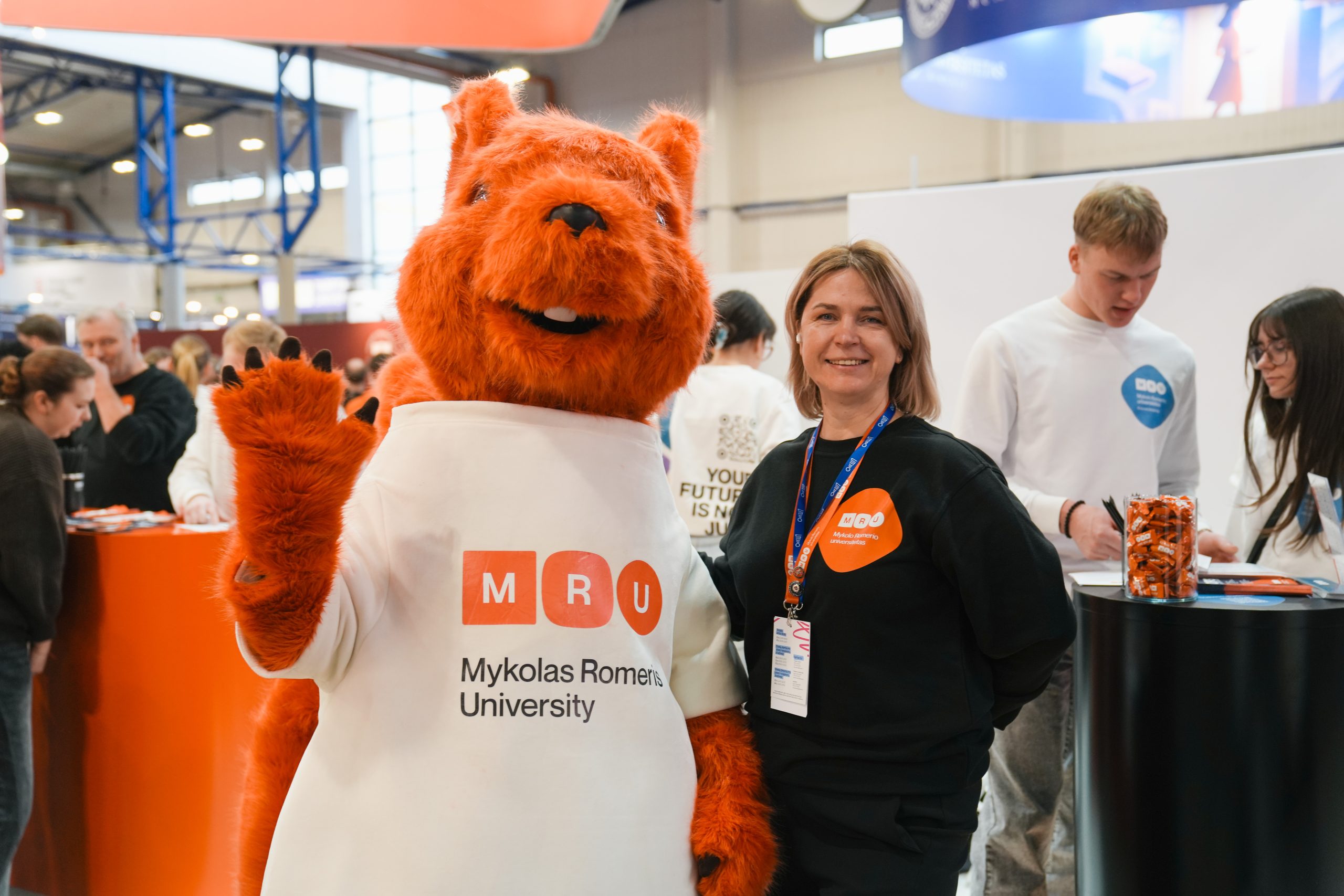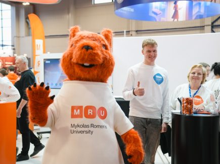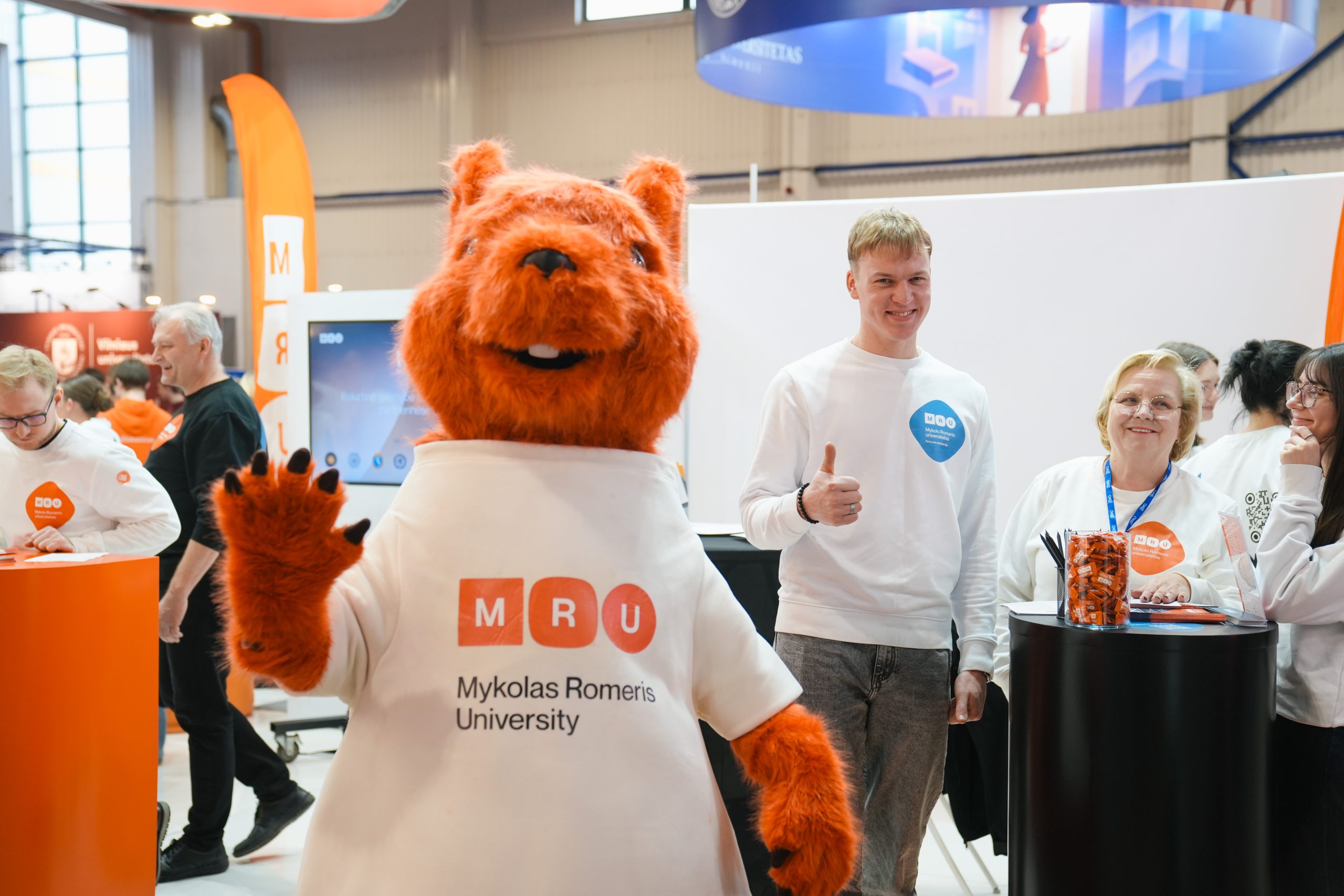 MRU stende lankytojus pasitiko priėmimo specialistai, fakultetų atstovai bei studentai. O jaukią ir pozityvią atmosferą kūrė MRU talismanas Mruniukas, džiuginęs studijų mugės dalyvius. Jie pristatė naujas siūlomas studijų kryptis ir platų studijų programų pasirinkimą, pasakojo apie studijų kasdienybę, tarptautinius mainus, praktikų galimybes bei studijų ir darbo derinimą.
