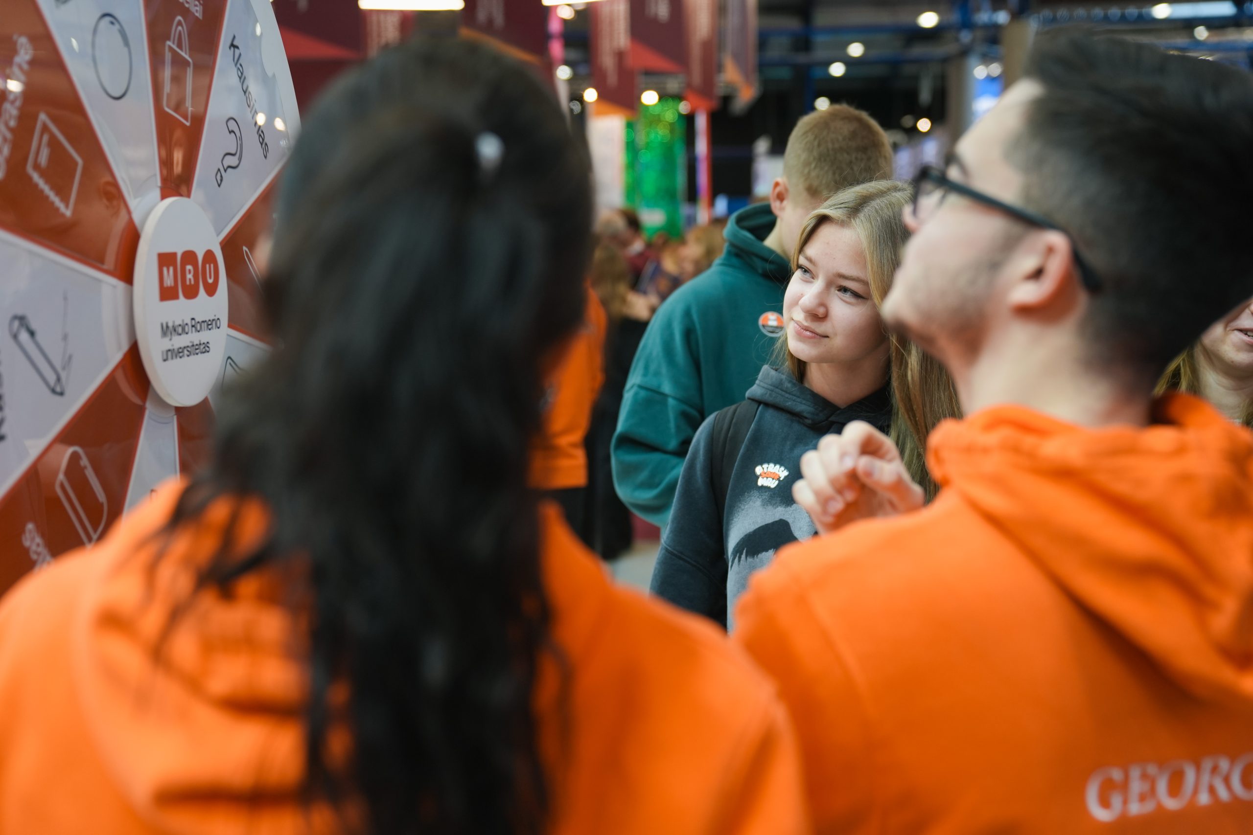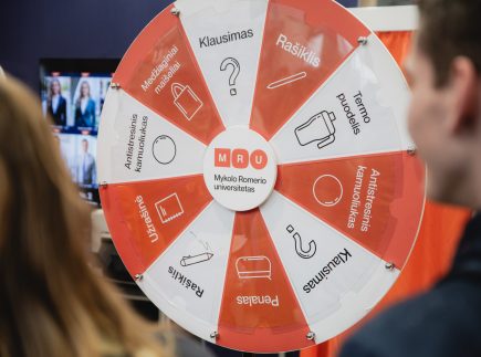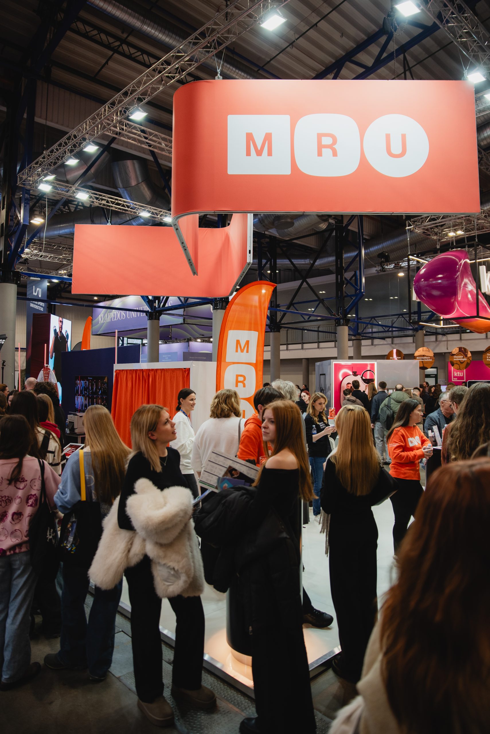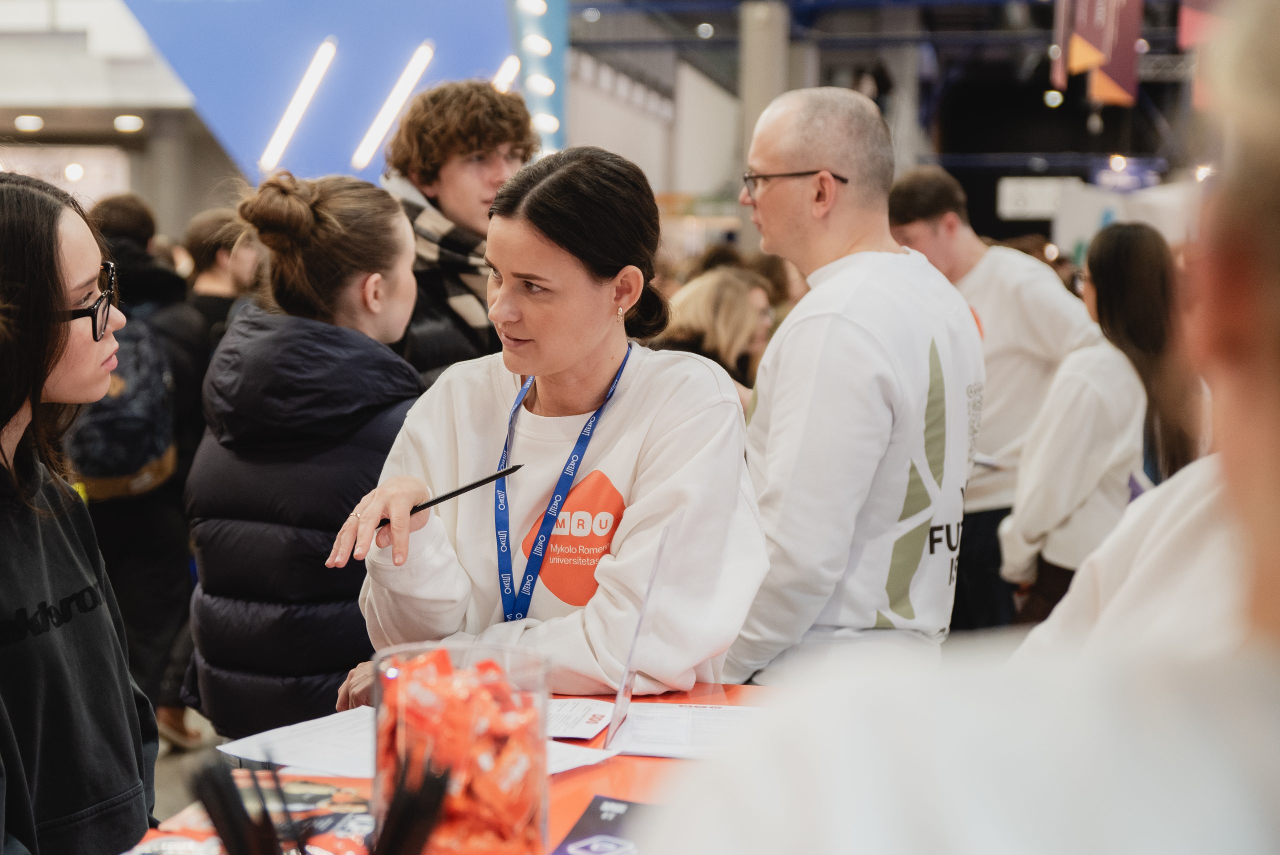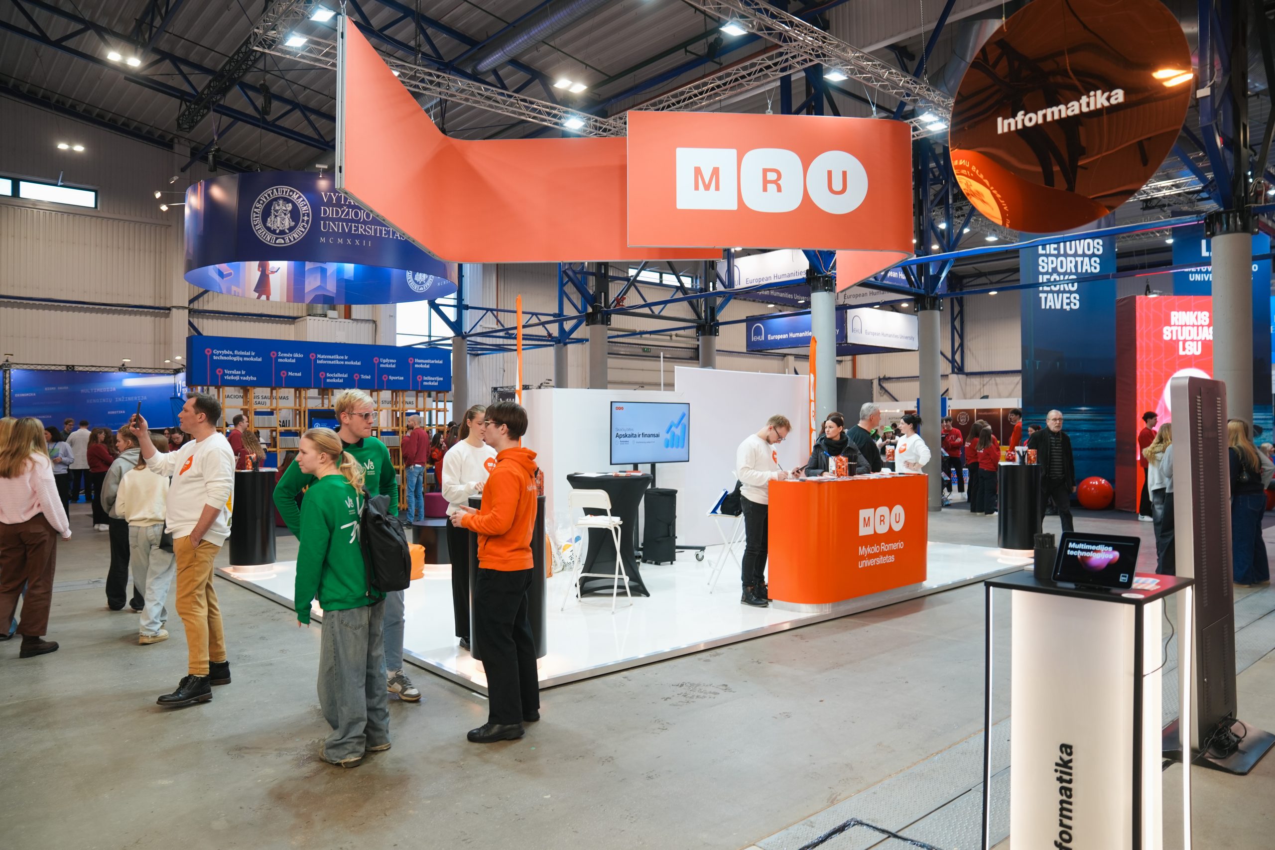 MRU stende lankytojus pasitiko priėmimo specialistai, fakultetų atstovai bei studentai. O jaukią ir pozityvią atmosferą kūrė MRU talismanas Mruniukas, džiuginęs studijų mugės dalyvius. Jie pristatė naujas siūlomas studijų kryptis ir platų studijų programų pasirinkimą, pasakojo apie studijų kasdienybę, tarptautinius mainus, praktikų galimybes bei studijų ir darbo derinimą.